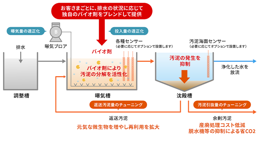 バイオ剤とデータ分析を組み合わせた新しいアプローチで、余剰汚泥を大幅に抑制。運用の効率化と省エネを同時に実現。