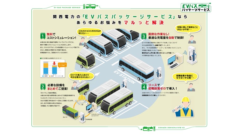 脱炭素だけでなく、経済性・BCP・快適性にも優れたEVバス。弊社のEVバスパッケージサービスは、お客さま毎に必要設備をパッケージでご提供いたします。