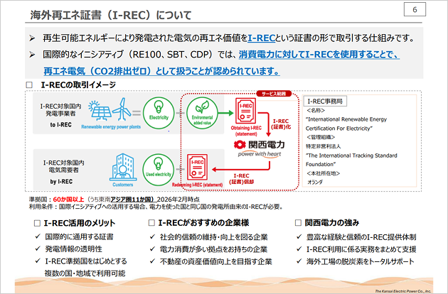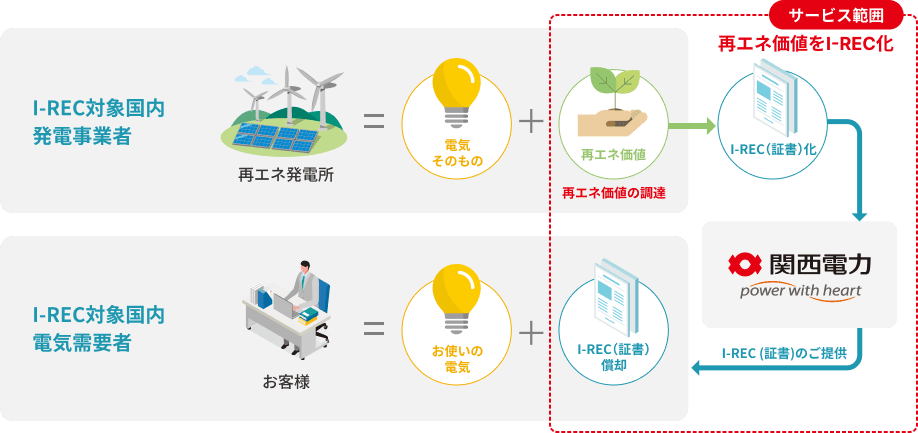 関西電力のIRECサービスは、海外の再生可能エネルギーにより発電された電力の環境価値を、国際的に広く利用されている再エネ証書「I-REC」として調達し、お客さまにご提供するサービスです。