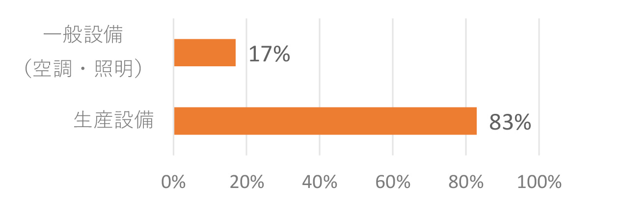 製造業では電力の83%を「生産設備」(加工機械・電気炉・コンプレッサー・ポンプ等)が占めるため、これらの省エネ対策は不可欠です。老朽設備を高効率機器へ更新することは、省エネに直結する有力な手段といえます。