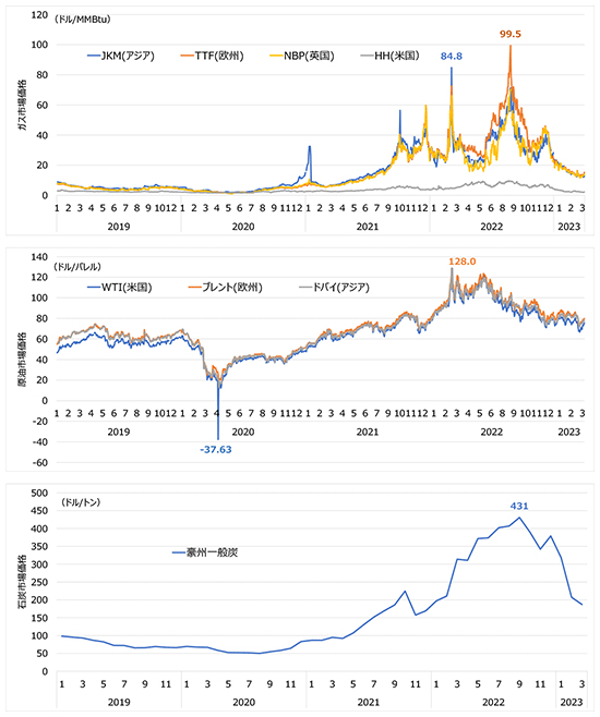原油・石炭・天然ガスはいずれも2022年に高騰し、その後も高止まりしています。