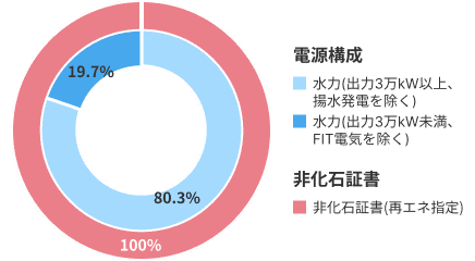 - 水力発電の電気に再生可能エネルギー指定の非化石証書を付加し、水力100%の再エネ価値を有したCO₂フリーの電気をご使用いただけます。