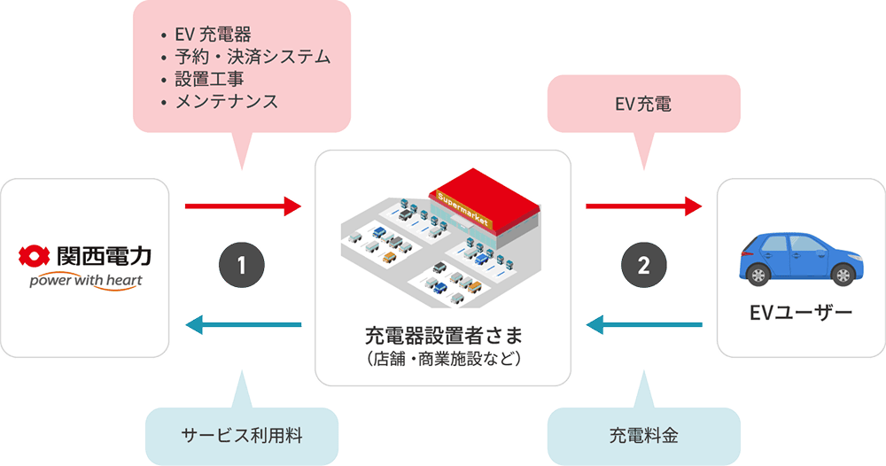 お客さまの施設に合わせた充電器の提案から、設置工事、管理まで一貫して関西電力がサポートいたします。
