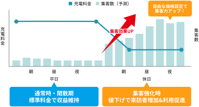 繁忙時間帯の集客最大化を図ります。(例)EV充電器の戦略的な料金設定による集客最大化