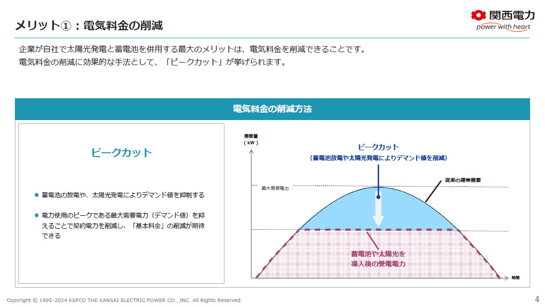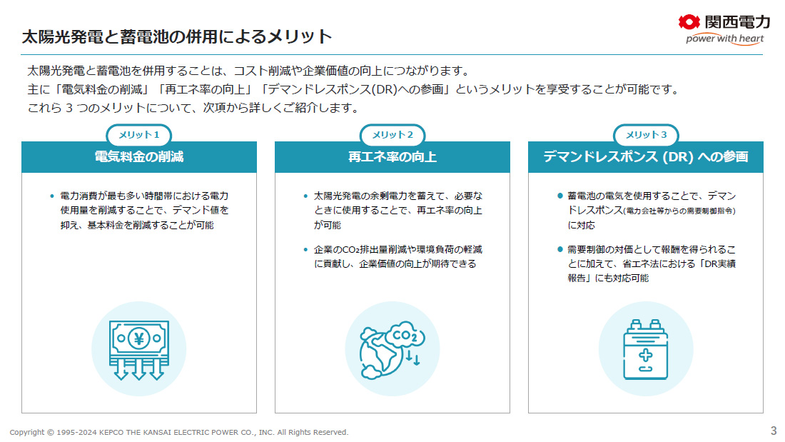 太陽光発電と蓄電池を併用することは、コスト削減や企業価値の向上につながります。主に「電気料金の削減」「再エネ率の向上」「デマンドレスポンス(DR)への参画」というメリットを享受することが可能です。これら 3 つのメリットについて、詳しくご紹介します。