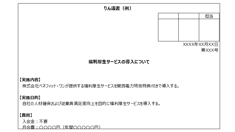 「福利厚生サービス」 の導入を検討しているけど、「社内で稟申する時間がなかなか取れない…」 「りん議に何を書いたら良いのか分からない」 といった課題をお持ちの方のために、関西電力がりん議に必要な情報をまとめました。サンプルとして、社内説明に是非ご活用ください。