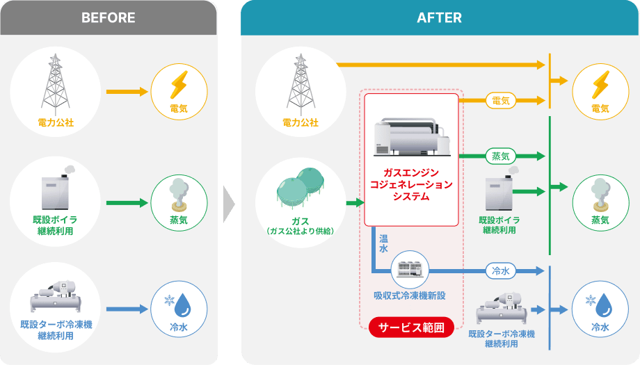 雷や脆弱な系統電力等の電力供給支障による製品被害の発生や、設備の高経年化にて増大するエネルギーコストの低減、CO₂排出量削減等の環境面での対応に悩まれているお客さまへ、ガスコジェネレーションの導入による熱電供給サービスをご提供しております。