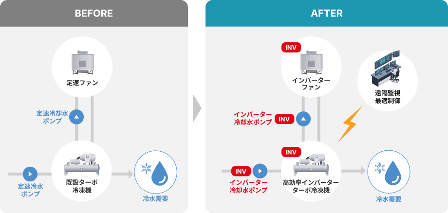 老朽化した冷凍機の更新や、CO₂排出量削減、海外工場の設備管理などに悩まれているお客さまへ、高効率冷凍機による熱供給サービスをご提供しております。初期費用ゼロで、導入時の工事から導入後の運用・メンテナンスまで、ワンストップでおまかせいただけます。