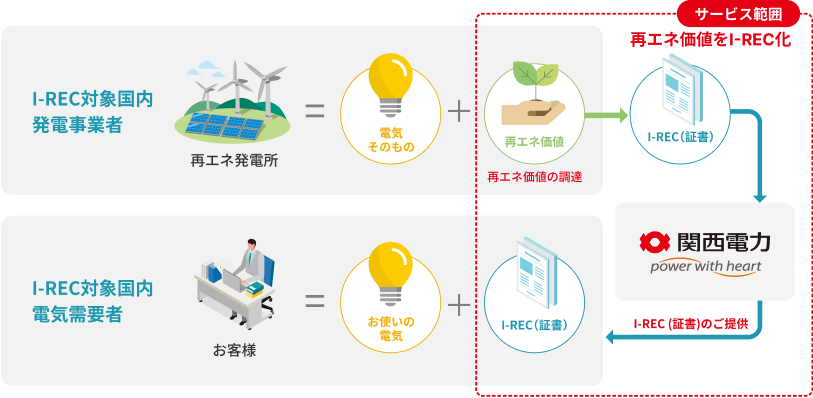 お客さまからのヒアリングに基づき、関西電力が適切な再エネ事業者等との交渉・調達、I-REC化手続き、管理、償却に至る一連の手続きを代行します。