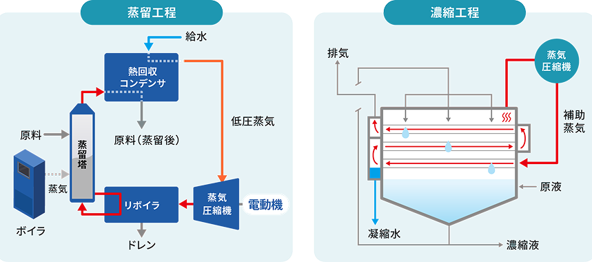 蒸留物自体の熱を熱回収コンデンサにより回収し、給水を蒸発させ蒸気圧縮機により再圧縮することや、原液自体の濃縮時に発生する蒸気を回収し、蒸気圧縮機により再圧縮することで、エネルギーの大幅削減を図ります。