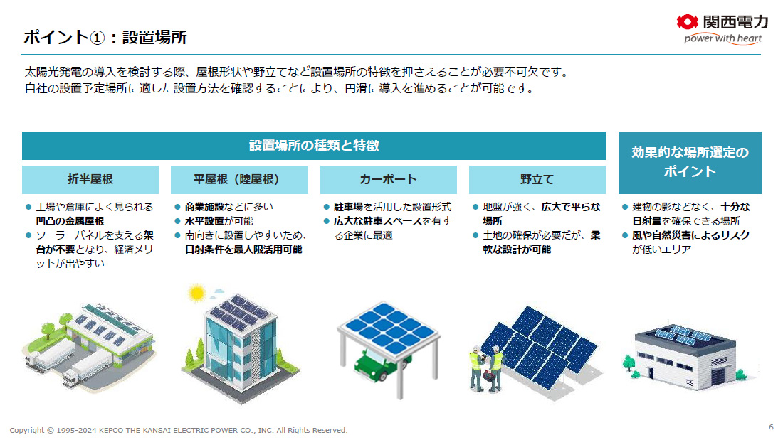 自社が太陽光発電の導入に適しているかを判断するためには、基本的な3つのポイントを抑えることが重要です。太陽光発電パネルの①設置場所、②設置面積、③設置建物の竣工時期です。これらについて、詳しく解説します。