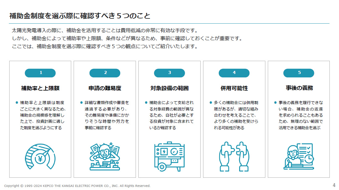太陽光発電導入の際に、補助金を活用することは費用低減の非常に有効な手段です。しかし、補助金によって補助率や上限額、条件などが異なるため、事前に確認しておくことが重要です。ここでは、補助金制度を選ぶ際に確認すべき5つの観点についてご紹介いたします。