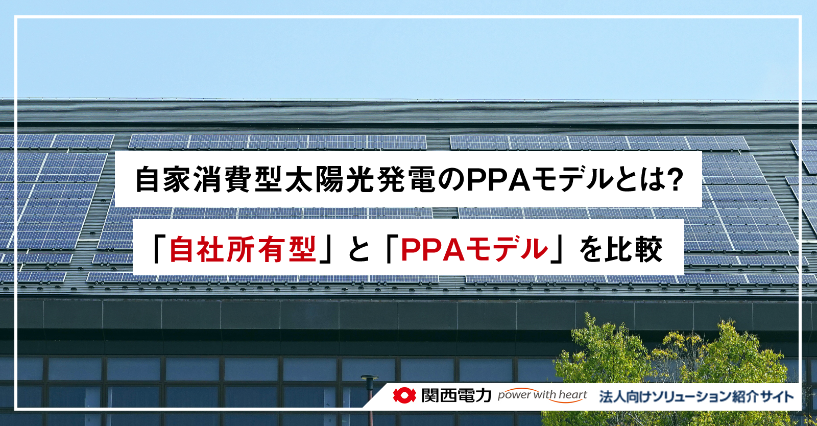 関西電力が提供する太陽光発電オンサイトサービス (https://sol.kepco.jp/taiyoko/) は、「PPAモデル」 の自家消費型太陽光発電であり、初期投資なしでCO₂排出量を削減でき、条件によって施設の電気料金を抑えられる場合があります。「PPAモデル」 の導入をご検討であれば、ぜひ関西電力にご相談ください。