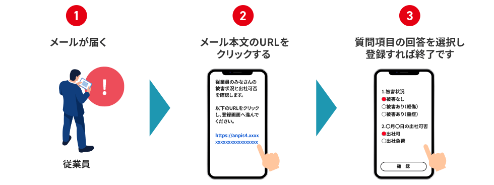 安否確認連絡への回答方法は、携帯電話やスマートフォンに届いたメールから回答するだけのカンタン操作!