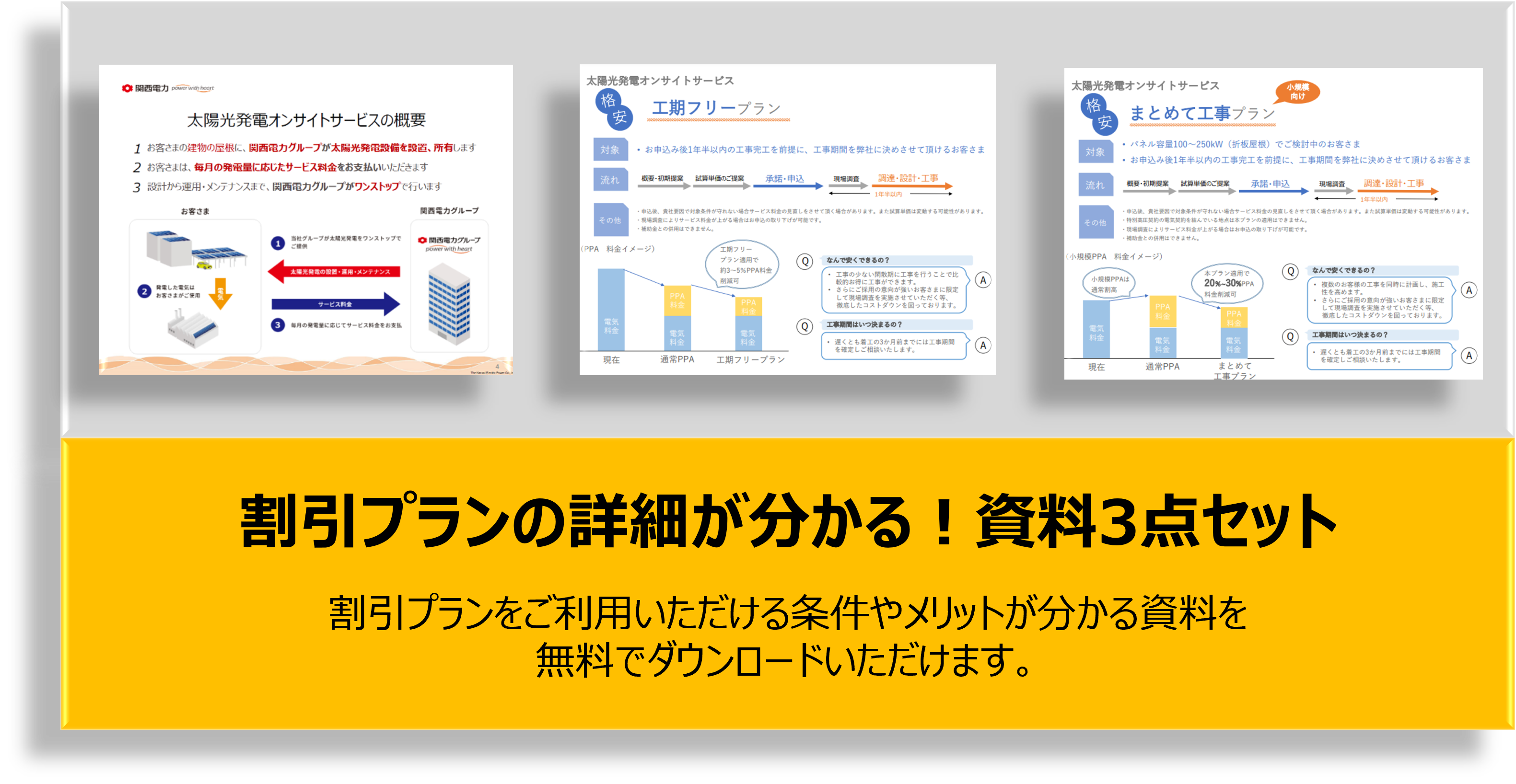 「太陽光発電の概要」に加えて、サービス料金を低減できる「まとめて工事プラン」「工期フリープラン」について、詳細をご確認いただけます。