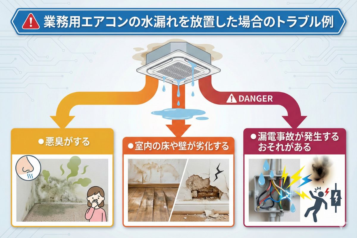 業務用エアコンの水漏れを放置すると、次のようなトラブルが発生するおそれがあります。