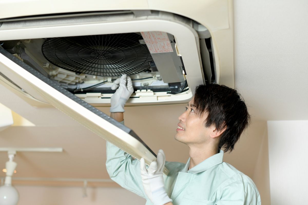 天井埋め込み型の業務用エアコンを使用している場合、脚立を使ってパネルを外し、フィルターを取り外す必要があります。1人で行うのは危険なので、2人以上での対応を心がけましょう。