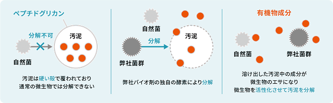 バイオ剤を投入することで、通常の微生物では分解できない「ペプチドグリカン」を分解する